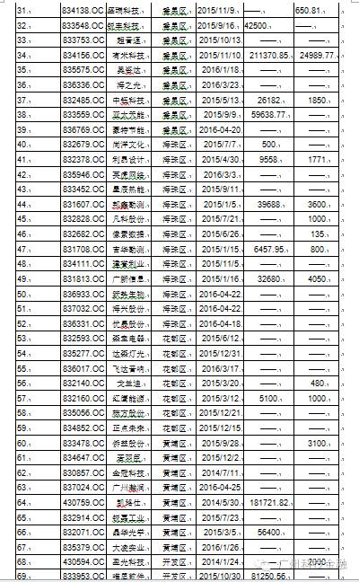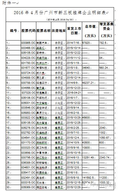 2016年4月30日,广州市新三板挂牌企业总数达到200家。其中,4月份新增挂牌企业22家,新增挂牌企业数比去年同期高出18家,增长速度明显加快。截至4月底,全市新三板任务完成率达到27.5%。 截止到2016年4月30日,广州市新三板企业总融资金额为49.61亿元,2016年前四个月成功募资23亿元,已接近2015年全年的总募资金额。 截止到2016年4月30日,广州市各区新增新三板挂牌企业数排名前三的分别是开发区(15家)、天河区(15家)以及番禺区(6家);新三板工作任务完成率排名前三的是天河(50%)以及开发区(50%)、从化区(40%);增城区完成率为0。 截止到2016年4月30日,全国新三板挂牌企业总数为6945家,其中4月新增新三板挂牌企业数为597家,新增挂牌企业数高于去年同期383家。 全国各城市新增新三板挂牌企业数排名前六的城市分别是北京(83家)、上海(59家)、深圳(52家)、苏州(27家)、杭州(24家)以及广州(22家)。附件一:2016年4月广州市新三板挂牌企业明细表(可点击“原文阅读”进行下载、查看)
